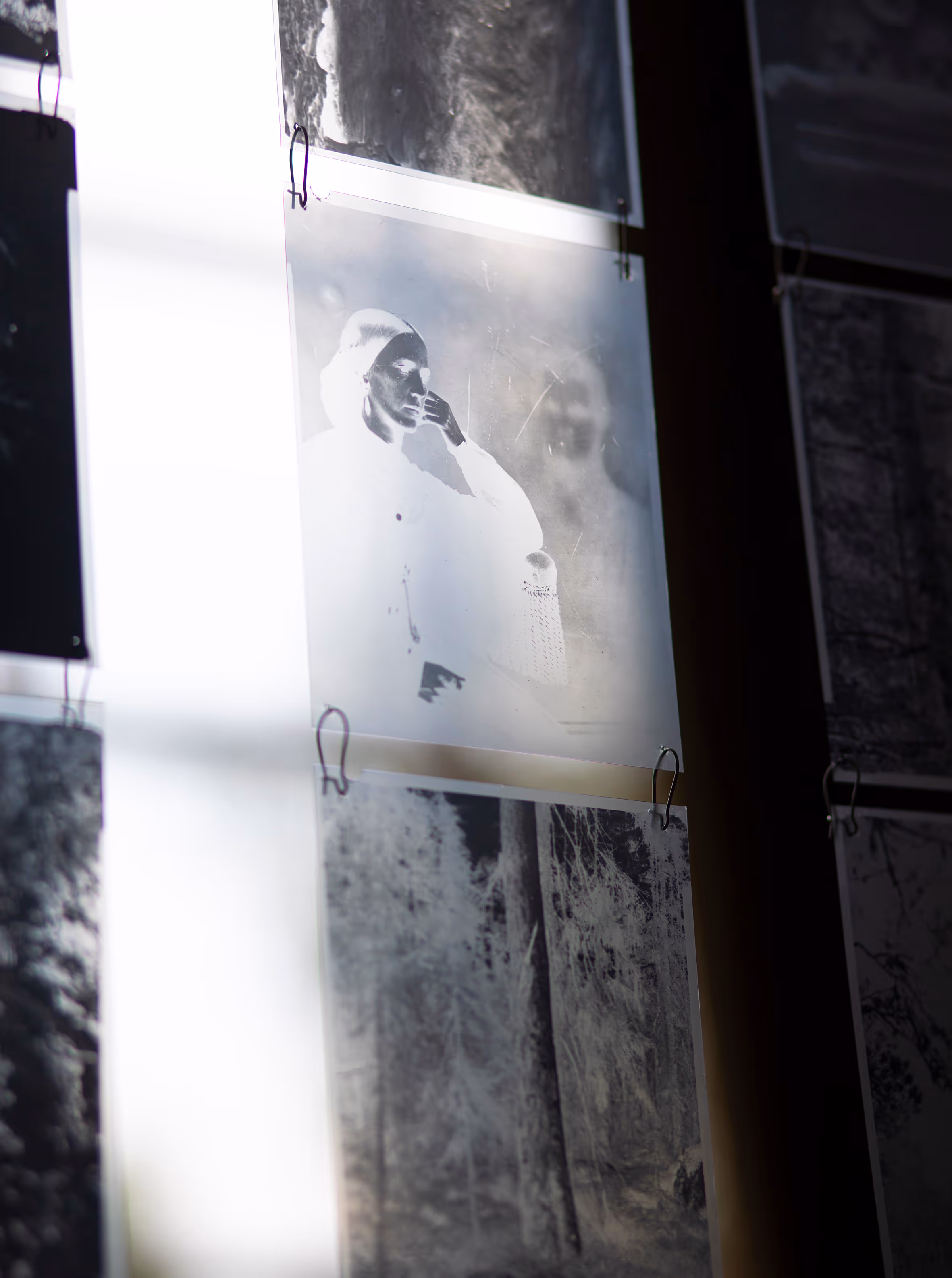 "Through rapid exposures of large-format negatives and methodical notes in moving images, with motifs from Swedish nature reserves, the artist duo Hagren/Bela make visible a series of black-and-white snapshots of the rare elements of dead wood in our forest landscapes. Creating haunting images by exposing prints in the darkroom using sparks and flames from a lighter allude to how the pine tree, by being ravaged by lightning strikes and fires, increases its resin production in such a way that it ultimately embalms itself. And from the artists photographs, filmed sequences and resin casts – where traces of something elusive are fixed – the silver pines rise as primeval forest-like tree relics; as remnants of coniferous forest with an ability to abolish the boundary between living and dead. Perhaps the portrayed trees, with such an age that their trunks shimmer silver-gray, can be seen as reminders of the transience of life? But in their state of limbo, the dead wood also constitutes a prerequisite for survival, as invaluable habitats for around half of all red-listed species in our forests.”
