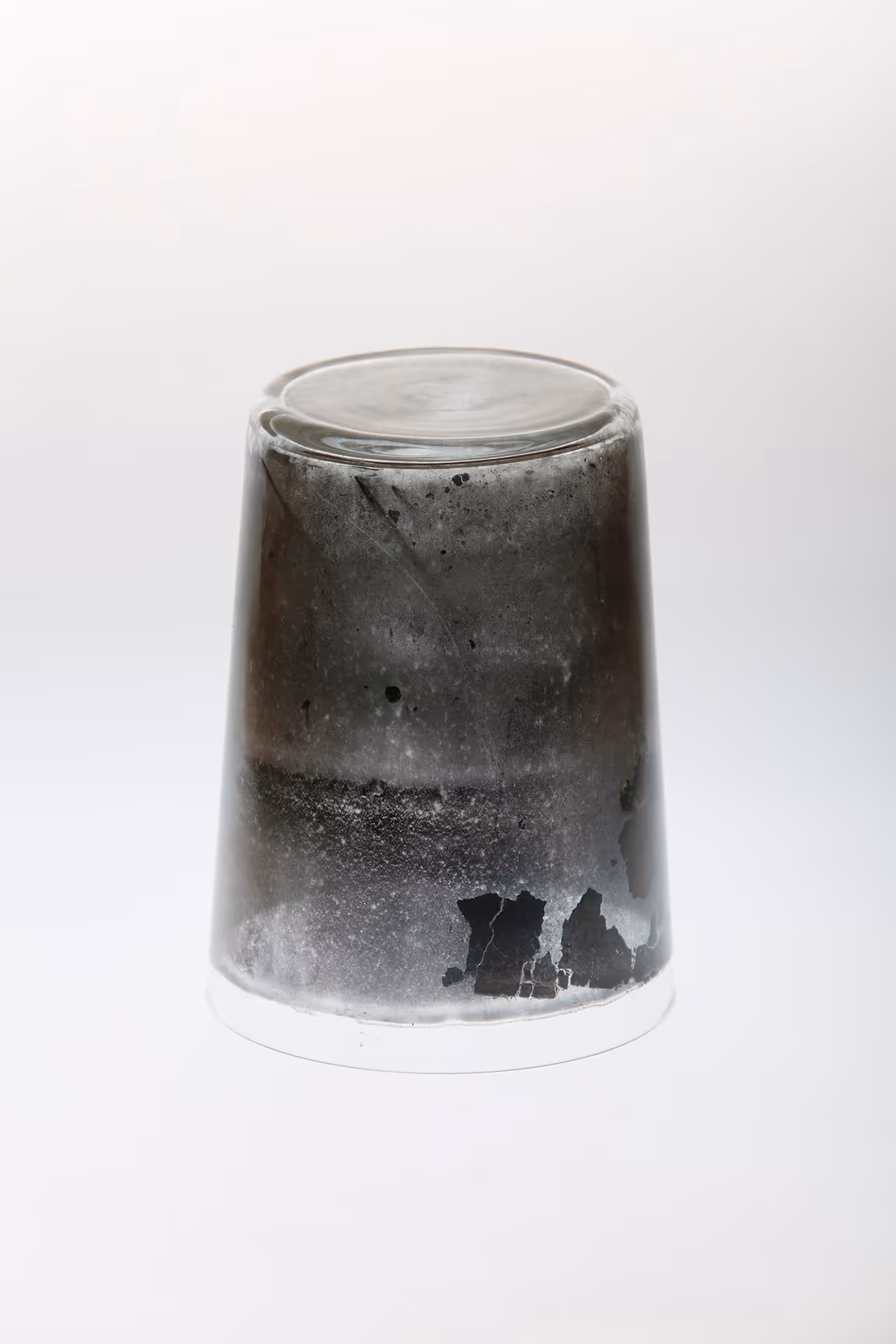 The gesture of experimentation, appropriation, transformation, and recycling is simultaneously present both in the behind-the-scenes works exposing the creative processes, as well as the resulting artworks themselves. We can observe the gradation that is generated when developing the discarded, improperly stored, light-struck photo paper. We can see tiny objects, slightly reflective surfaces set on the edges of petri dishes, globes and glasses, figures, marbled paper, which are all formed from the silver collected from the used fixer via zinc plates or electrolysis.