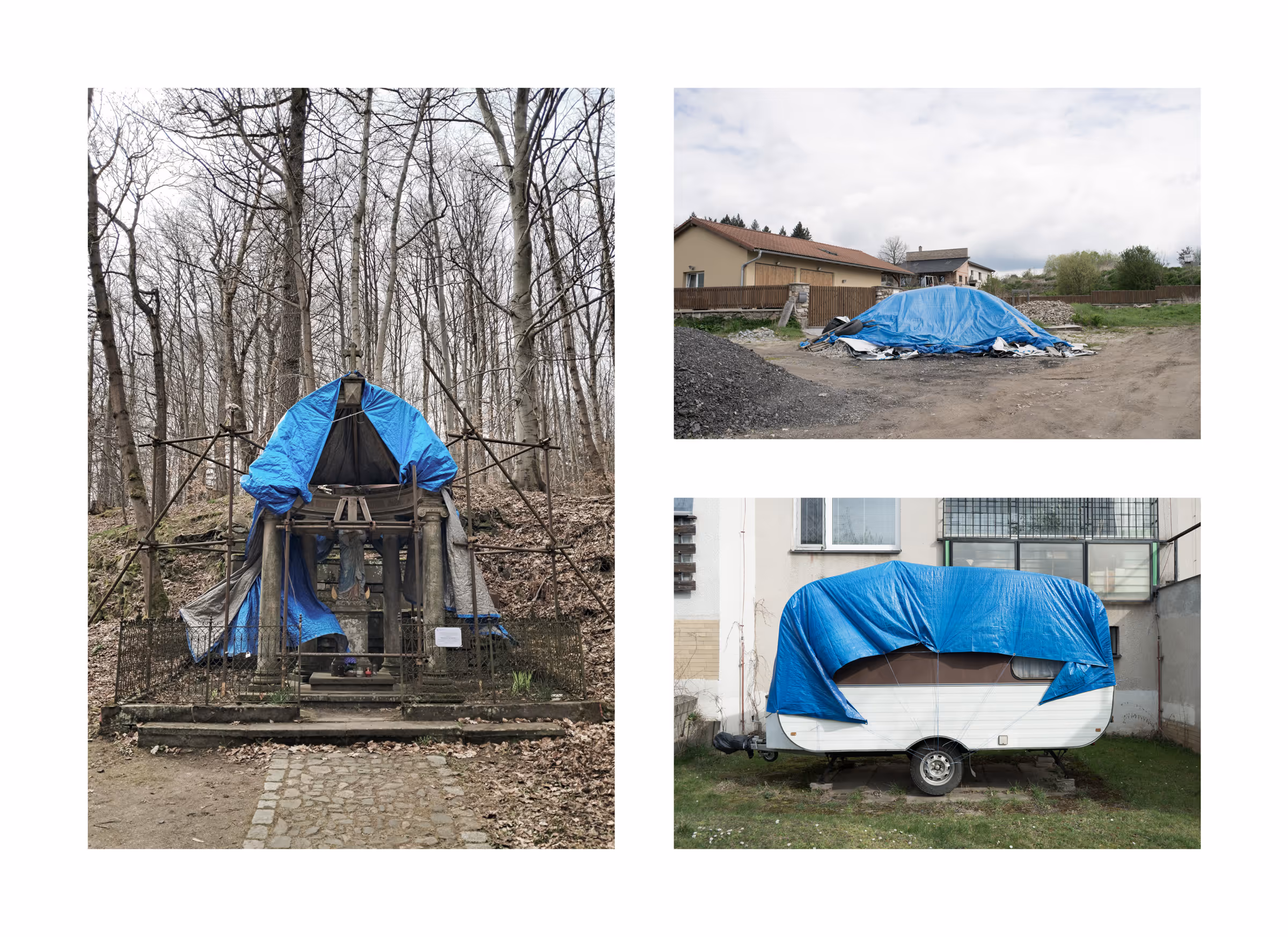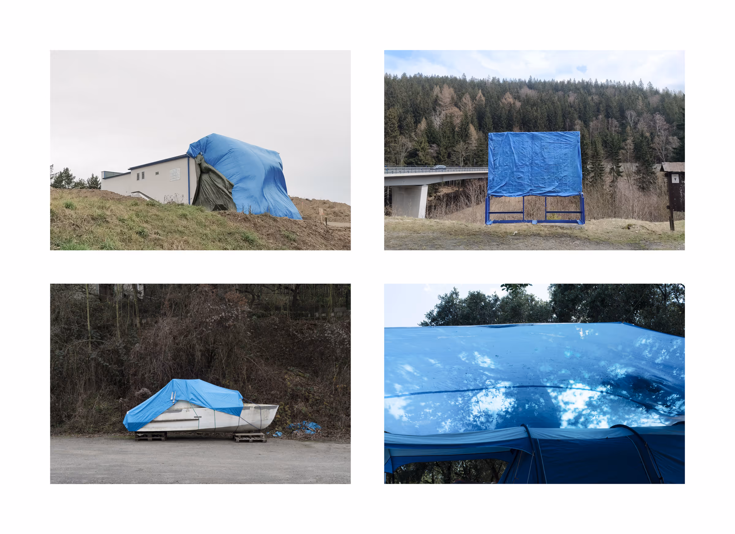 Blue Tarp – a hyperobject that cannot be escaped. One of the symbols of the current state of the world. It appears in both urban and natural landscapes, surprising me with each new incarnation. It conceals the treasures of gardeners, unfinished works of builders, or slowly decomposes among the leaves in the forest.