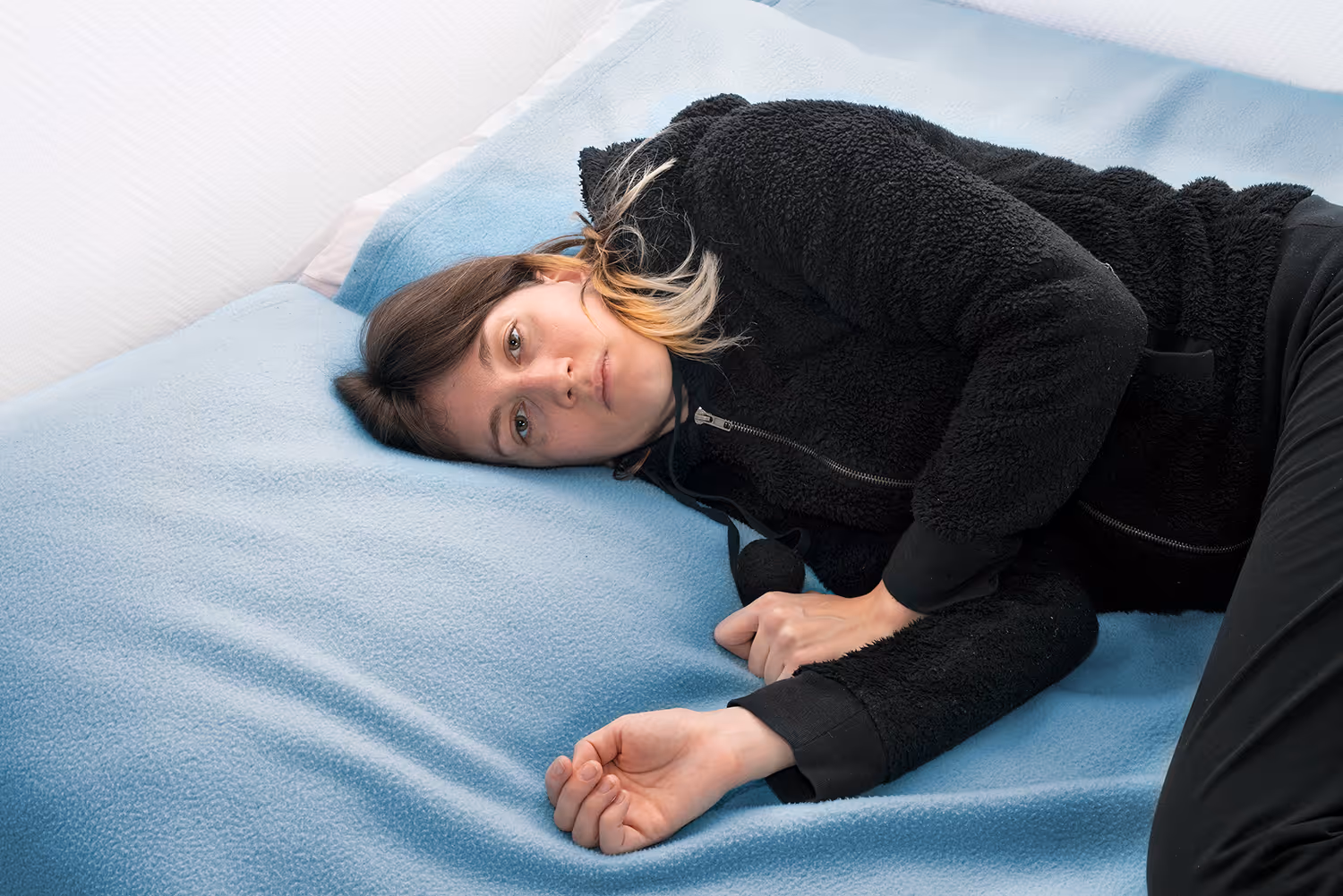 In parallel, following confrontations with her own physical and mental limits facing depression, she developped a new series of self-portraits: Revenir (Coming back). Using once again repetitive imagery and a consistent aesthetic, she explores the intersection of vulnerability, isolation, and transformation through self-portraiture. Photographing herself during moments of crisis and depression, she seeks to capture the disconnect between her inner world and reality.