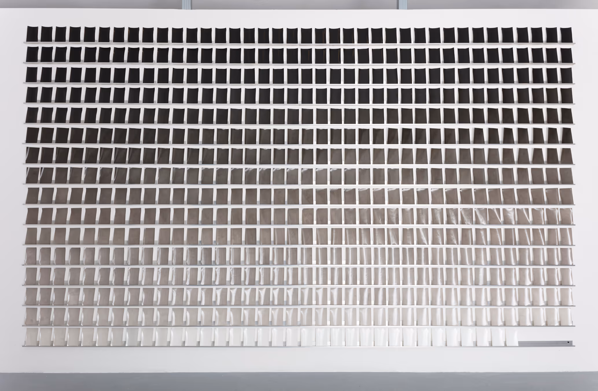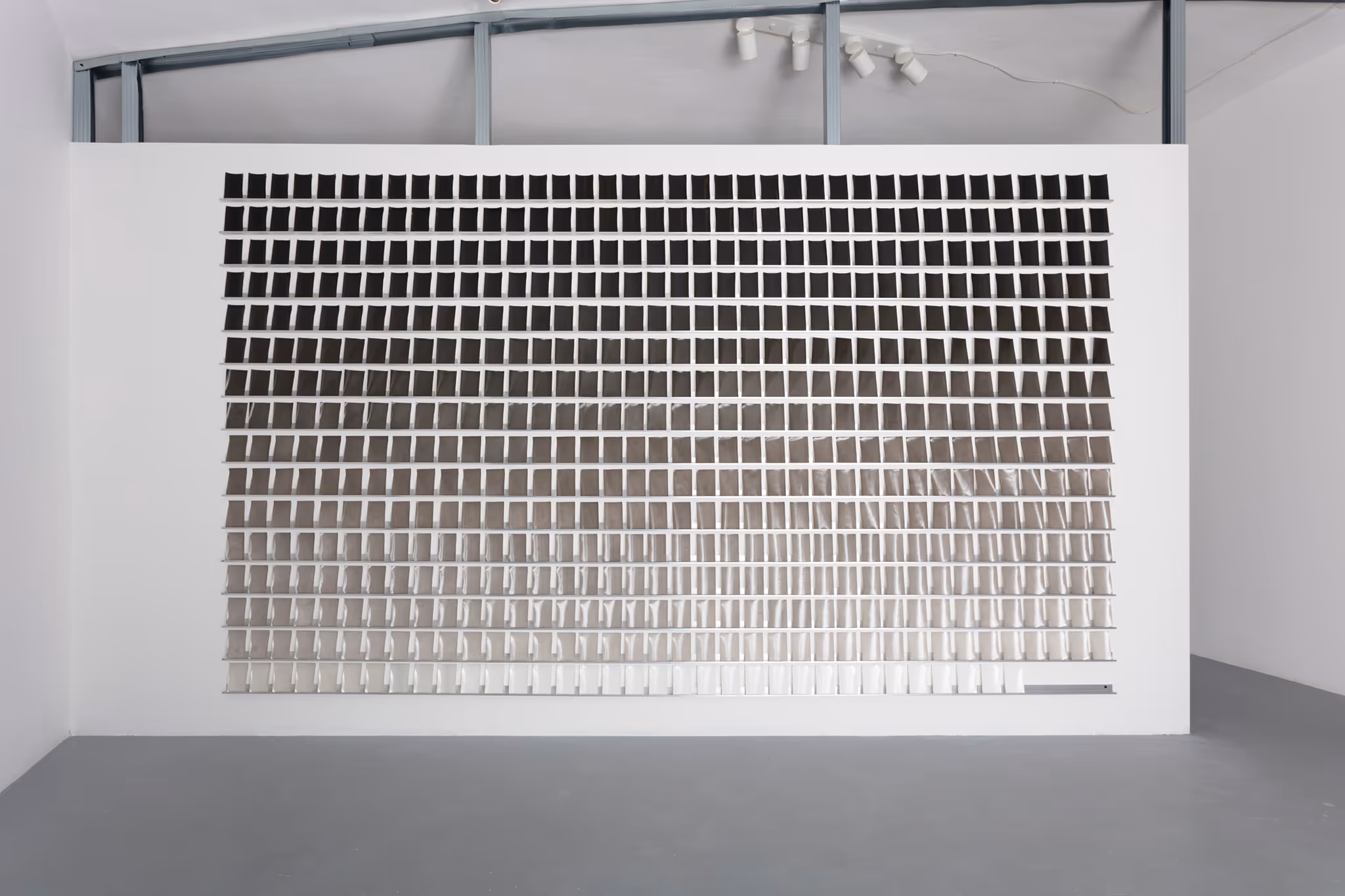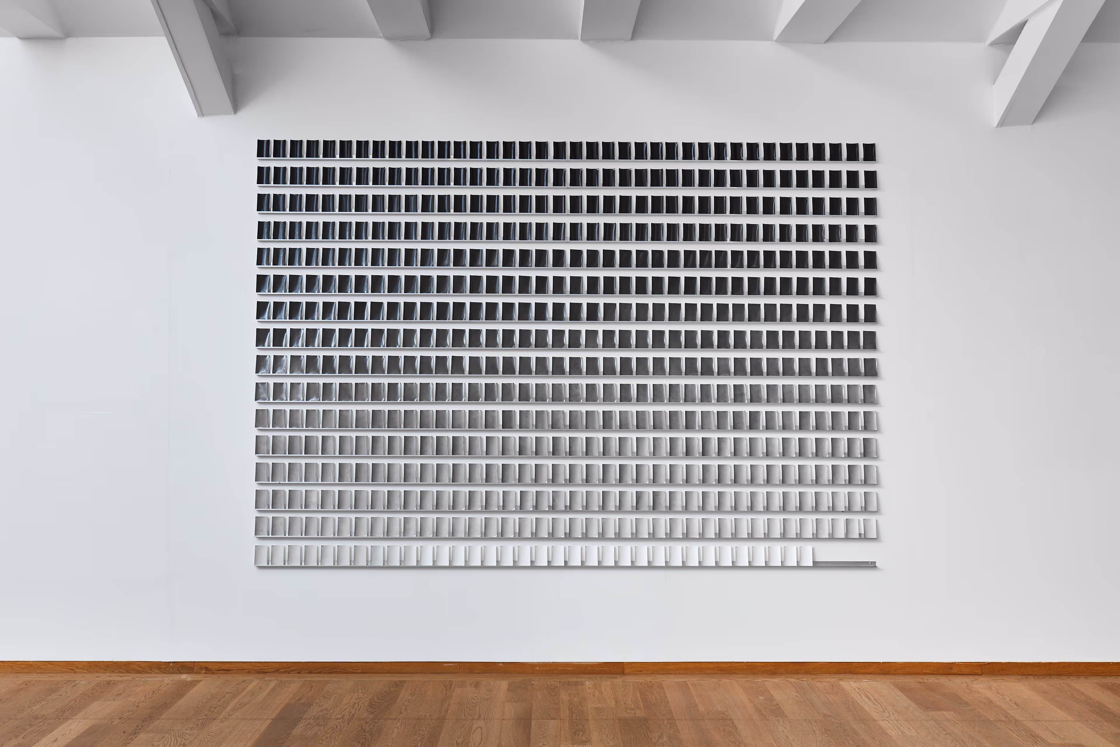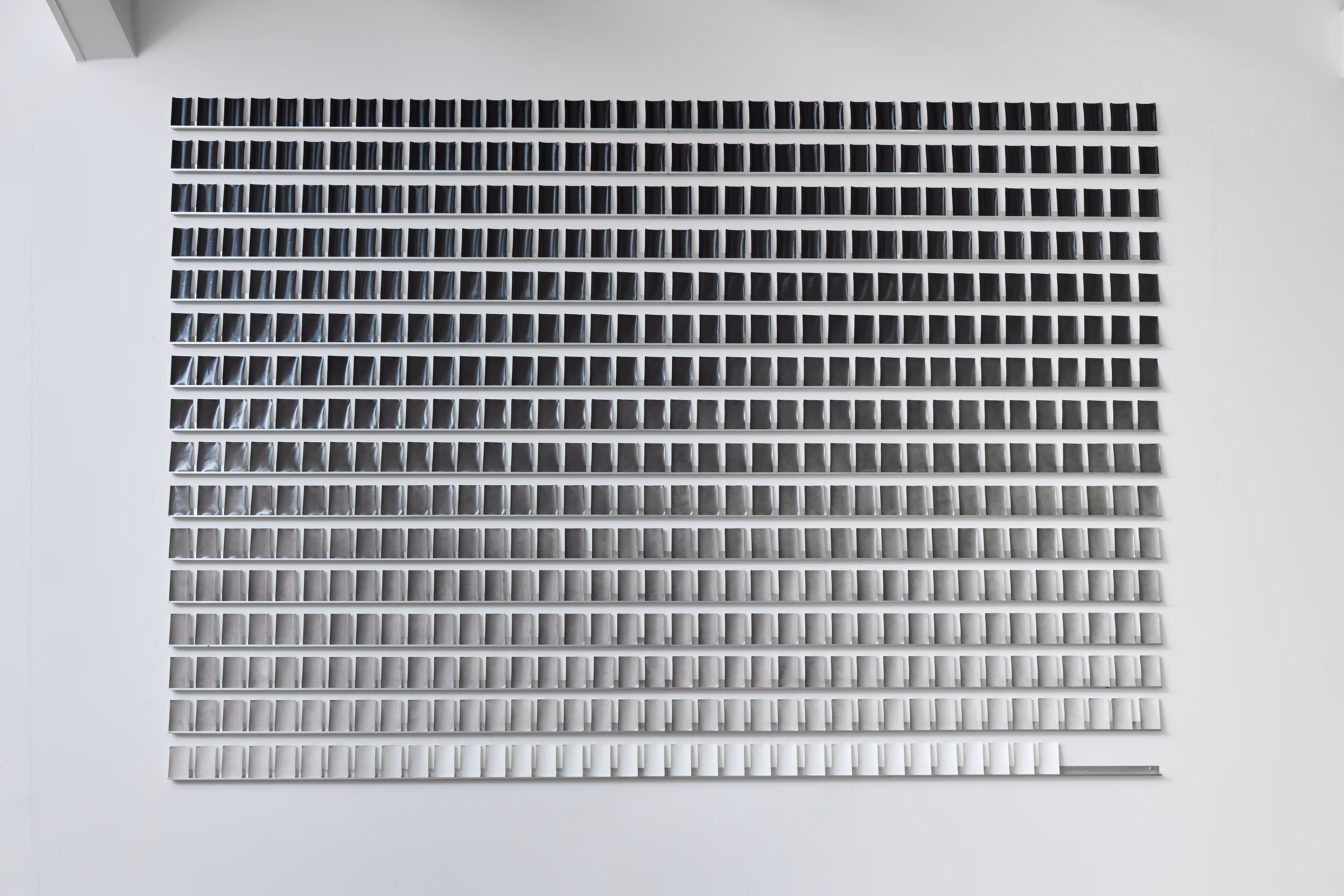 Neither is the analytical examination of photography’s internal structure and most fundamental components unknown to Dobokay’s artistic practice, nor is seriality. With its gradient counting more than 600 photographs, not only do the works newly made for this exhibition differ spectacularly in scale from his previous pieces, their repetition and the gesture of accumulation also reveal a shift in his creative approach. Overriding a possibly aesthetical selection, the authenticity of representation demands this time the complete presentation of the contiguous phases composing the process. The element of the series thus materialises the immaterial component of photographical image-making, time, while reflecting on the specific time experience of the creative process, as well as on the dilemma of the unrepeatable repetition. The symbolism of surfaces turning from dark and heavy qualities into light ones, the gradual exhaustion, as well as the transubstantiation of the material into the intellectual allow an at least as important interpretation of the apparently numerical-mechanical natured piece as the characteristic property of a technical procedure raised to the level of visual motif.