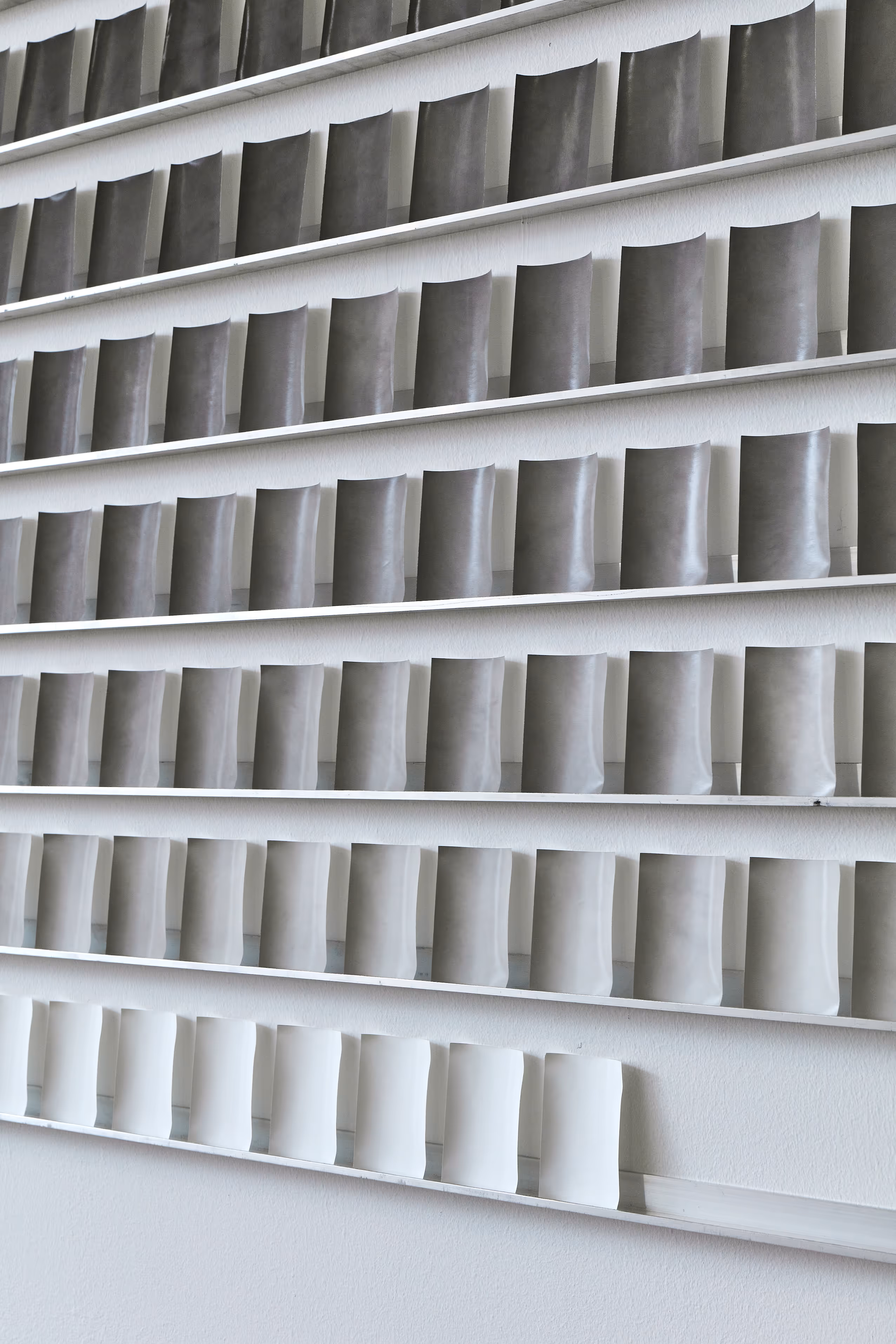 The painstaking, experimental attitude that characterizes the creative method of the artist is aimed at discovering and exposing the most essential inner structure of the medium. The exhibition titled Ag tackles questions related to the medium as well as to the relationship between creation and education. The teacher presenting the trade, the knowledge, and the technical information is browsing the used materials forsaken by the students. Thus, the basic motifs of the exhibition are made up of items that had been discarded, left behind by the students in the workshop and the photo lab: used fixer, test strips, and photo paper provide the basis for the artworks.