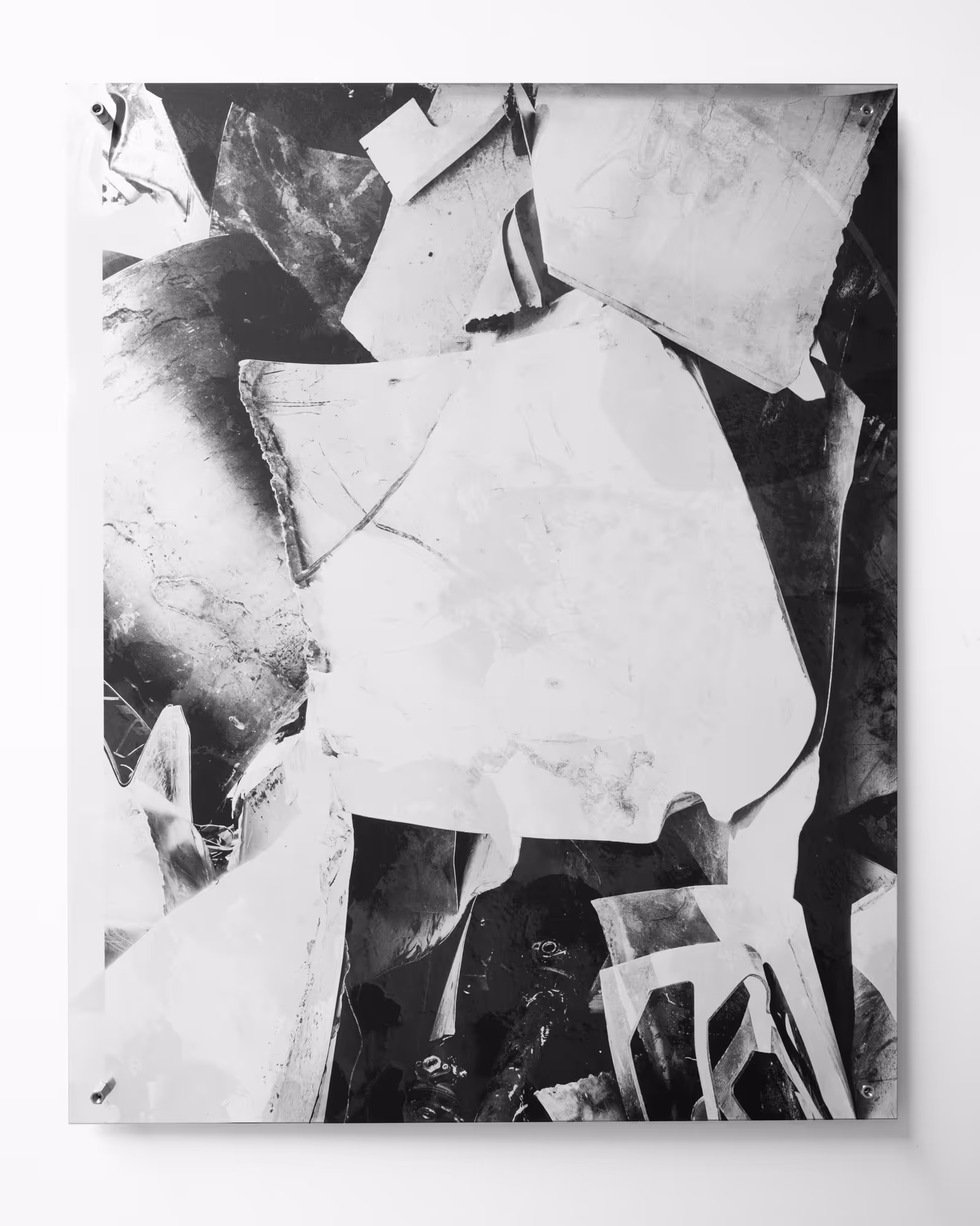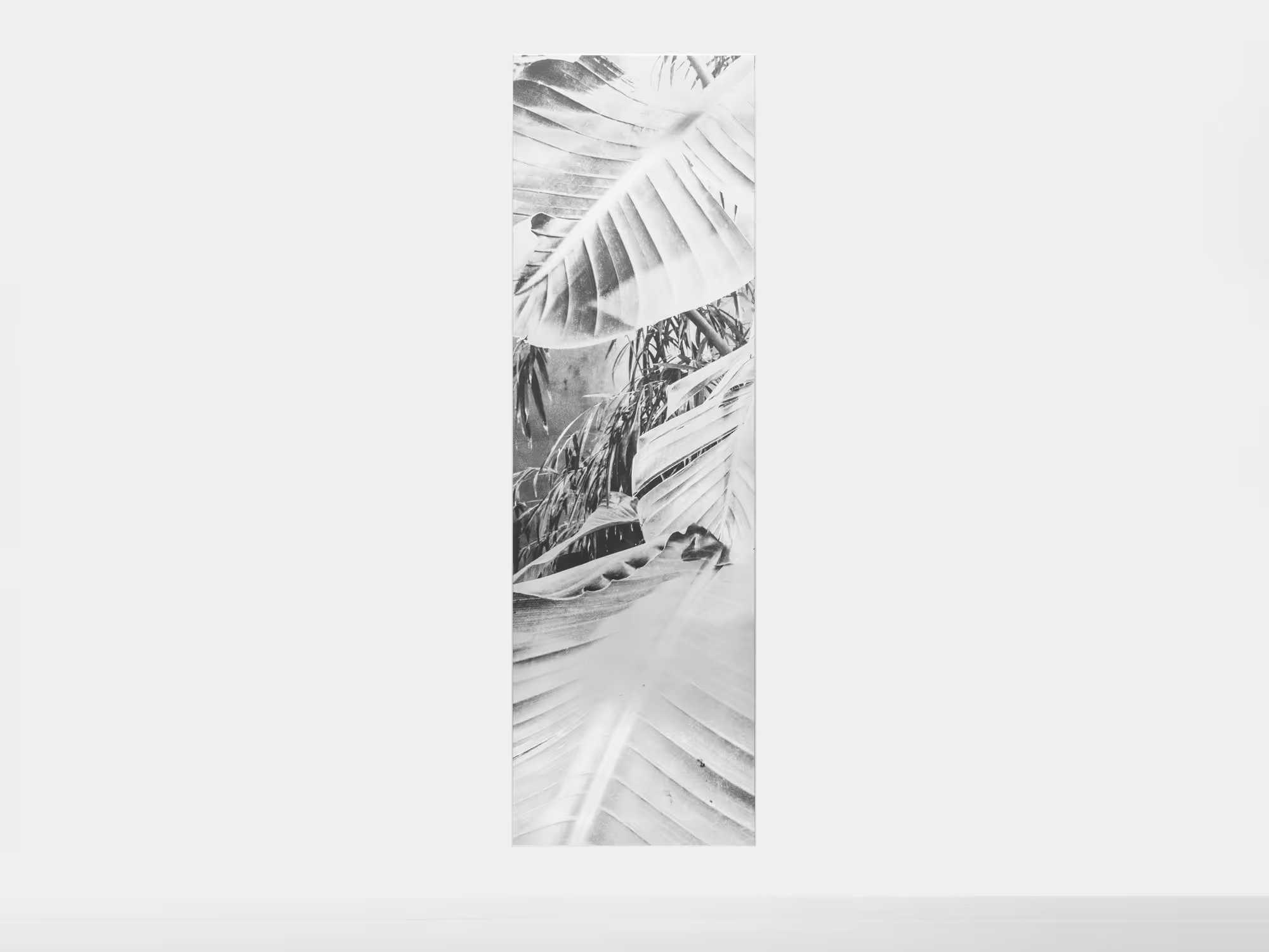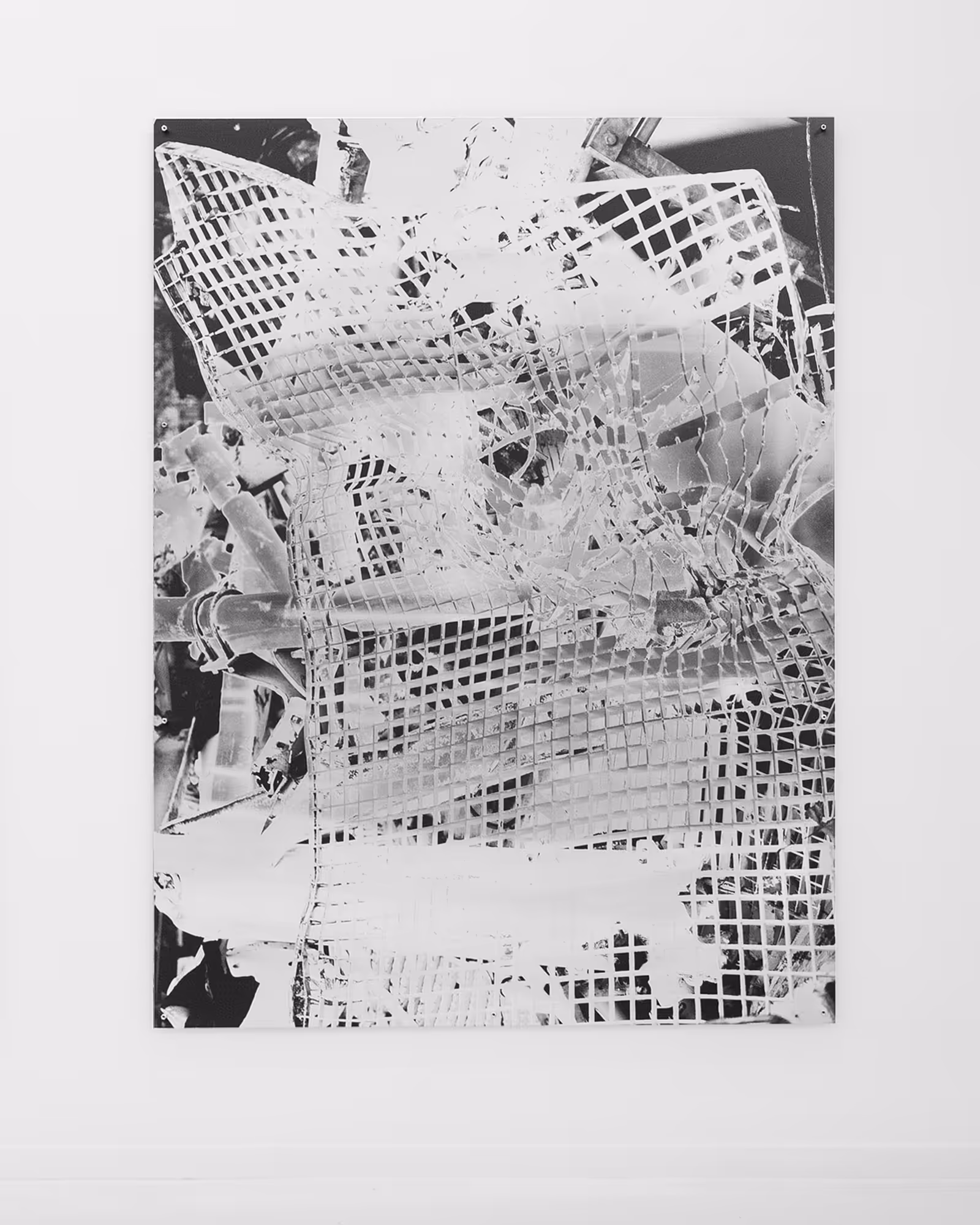 The series MUSA consists of twenty-six works of UV printed photographs on brass. The works are divided into three sizes which measure 150 x 200, 37,5 x 50 and 80 x 100 cm. The photographs for these works have been taken at various greenhouses in Morocco, which harvest Banana Trees. On the images we see abstract impressions of green and yellow leaves pressed against the plastic sheeting of the greenhouses. On top of that we see strips of copper wiring that keep the plastic sheets in position. It is the first series of images in Vanoverberghe’s work that solely puts the focus on the natural aspect of our surroundings.
