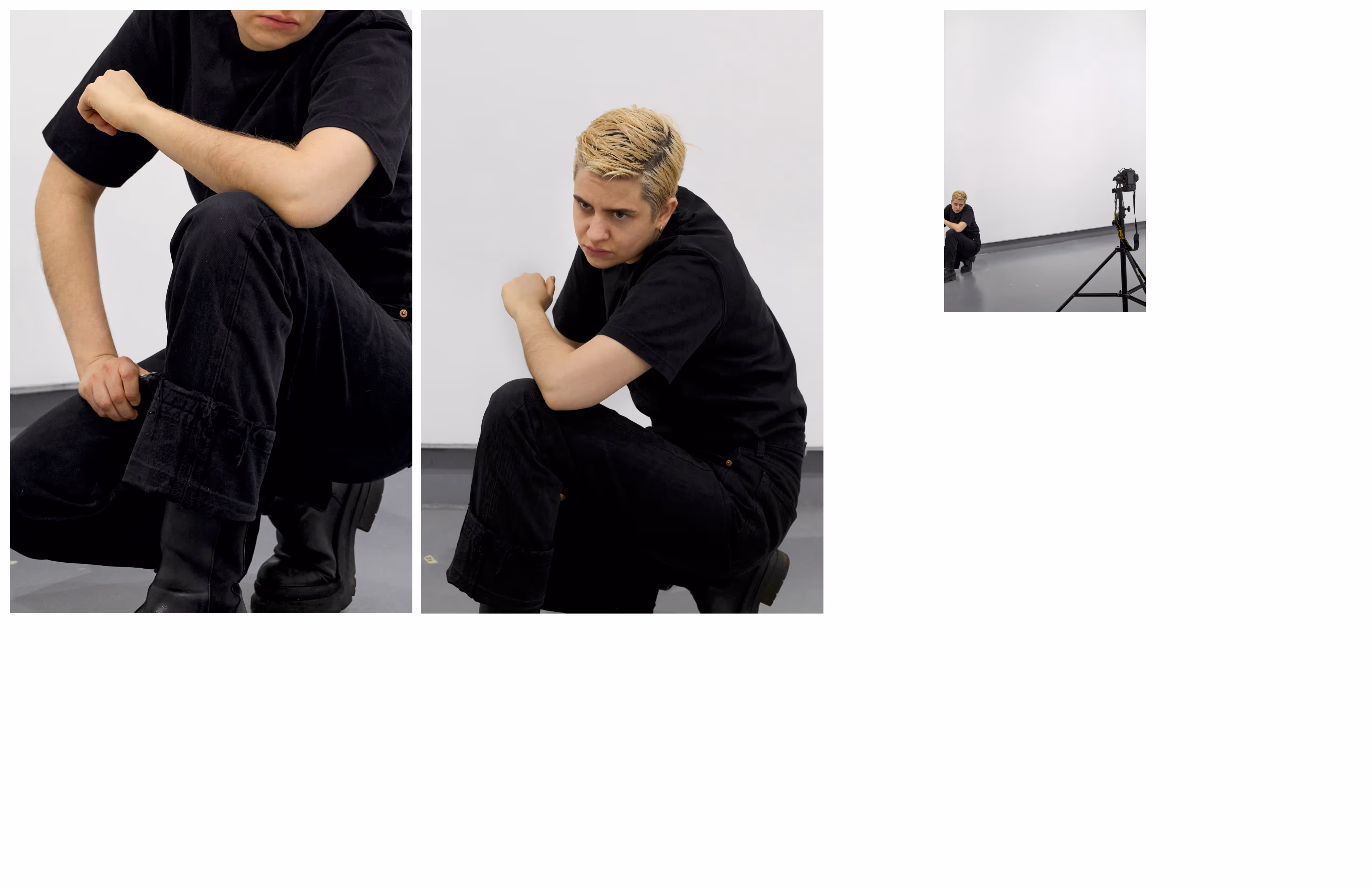 echo examines relations between self-expression, attribution, and socio-cultural codes within self-portarits. Within a studio set of three synchronized cameras, distinct lines between operator, referent, and spectator dissolve. Roland Barthes' four imaginary dimensions interlink as a reflection of the cis-heterosexual matrix and gendered markers. As a trans body, I am continually navigating internalized as well as projected politics of the gaze. echo examines the role of photography in (de-)constructing traditional identity categories to develop pluralistic views of individual and collective identity.