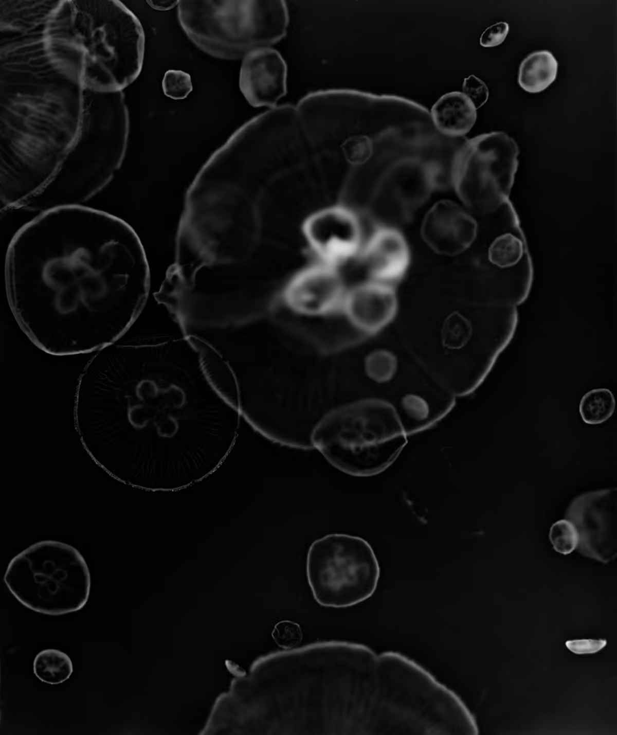 The term « gelification » of the seas has surfaced recently to describe the overabundance of jellyfish drifting by the thousands. Every disturbance to marine ecosystems seems to play in their favor. Overfishing, pollution, rising temperatures, and ocean acidification — all the upheavals caused by human activity — create ideal conditions for their expansion. Today, many sectors are affected by this proliferation: tourism, fishing, aquaculture, even water desalination; the cooling systems of nuclear plants are sometimes clogged by their presence, causing costly shutdowns. This project explores the turbulence of Mediterranean waters: could jellyfish be agents of ecological and political resistance in the face of human-induced violence?