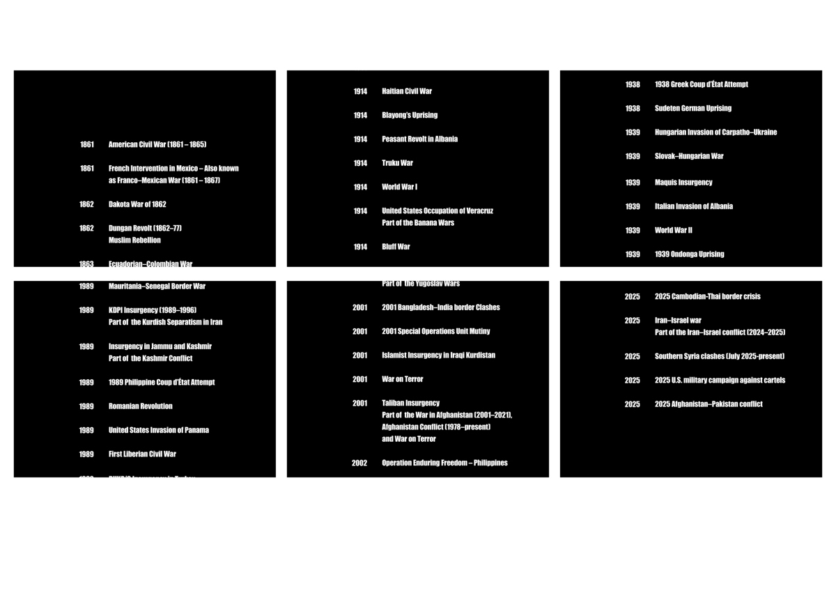 The War Movie is an image-less video that presents a complete list of all wars since the industrialization of warfare, beginning with the American Civil War of 1861 and continuing up to October 2025, formatted in the style of end credits. The soundtrack consists of a heavily distorted version of the U.S. national anthem, The Star-Spangled Banner. The work references, among other things, key questions in image politics: how violence and war can be represented without reproducing them.