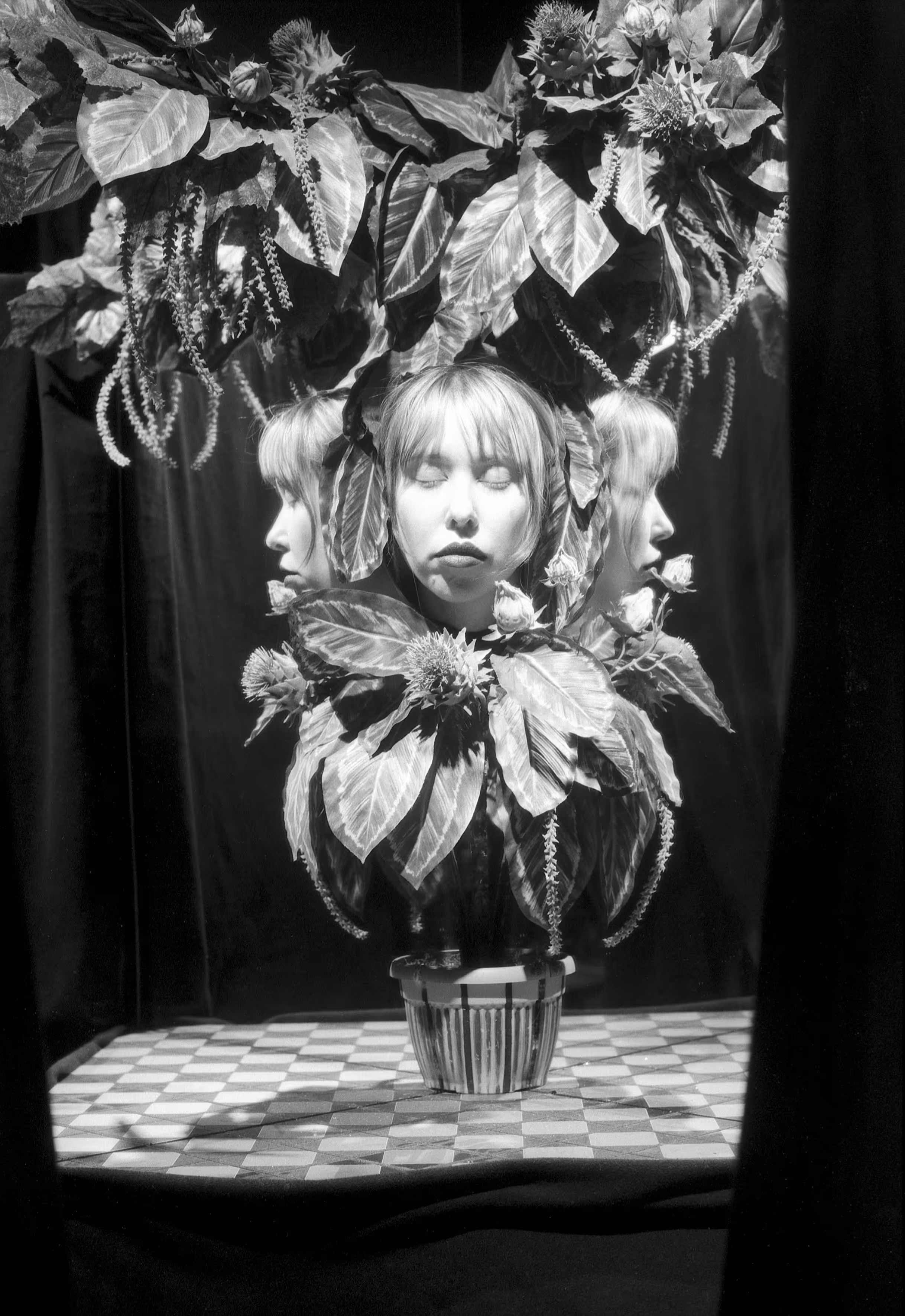 Photography, as a "haunted medium," plays a central role in her work, preserving traces of the past while shaping imagined futures. Through analogue and experimental techniques such as chemigrams, she investigates the materiality of the photographic image. From self-portraits to staged compositions, her process is deeply hands-on, involving set construction, object-making, and direct engagement with physical materials.