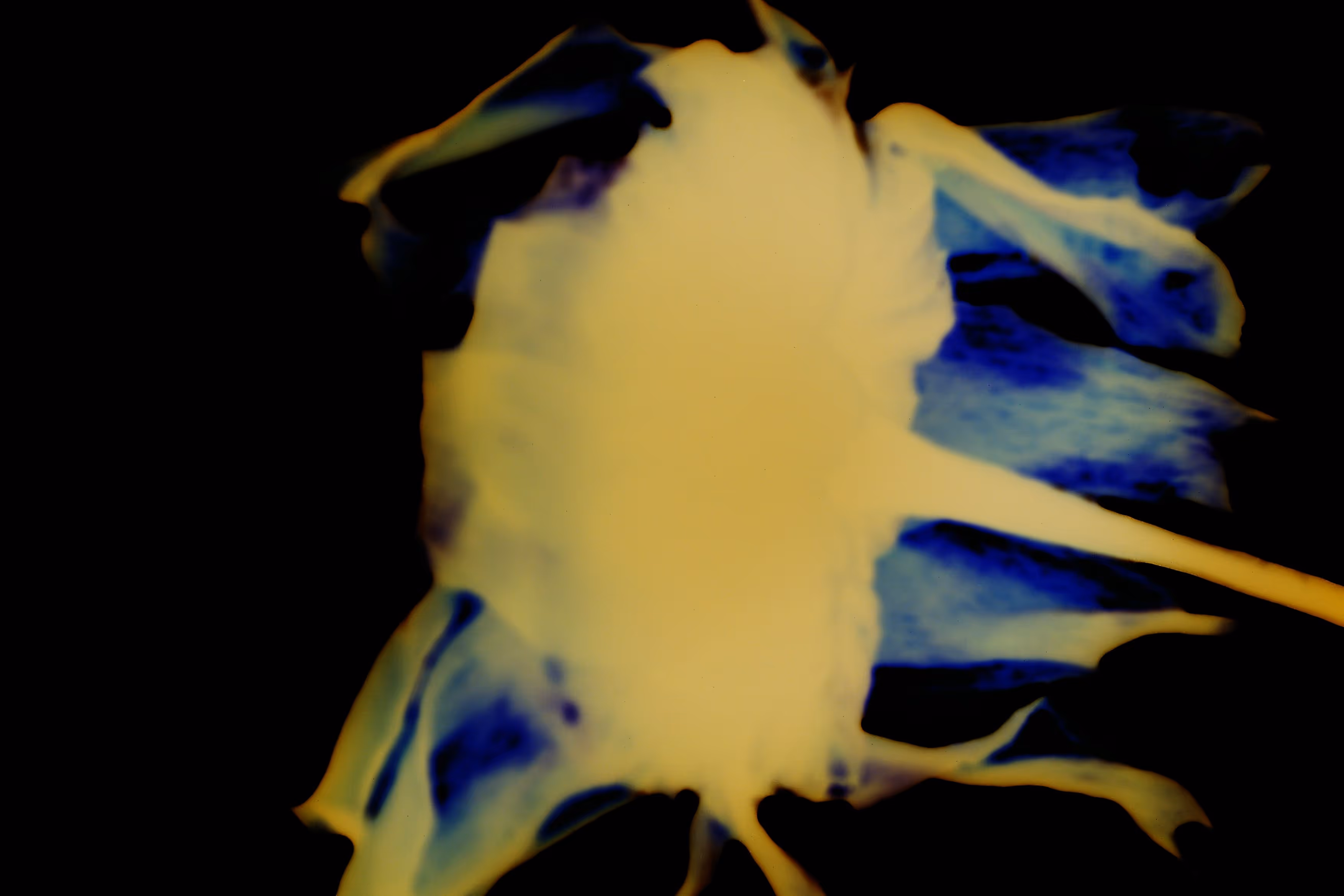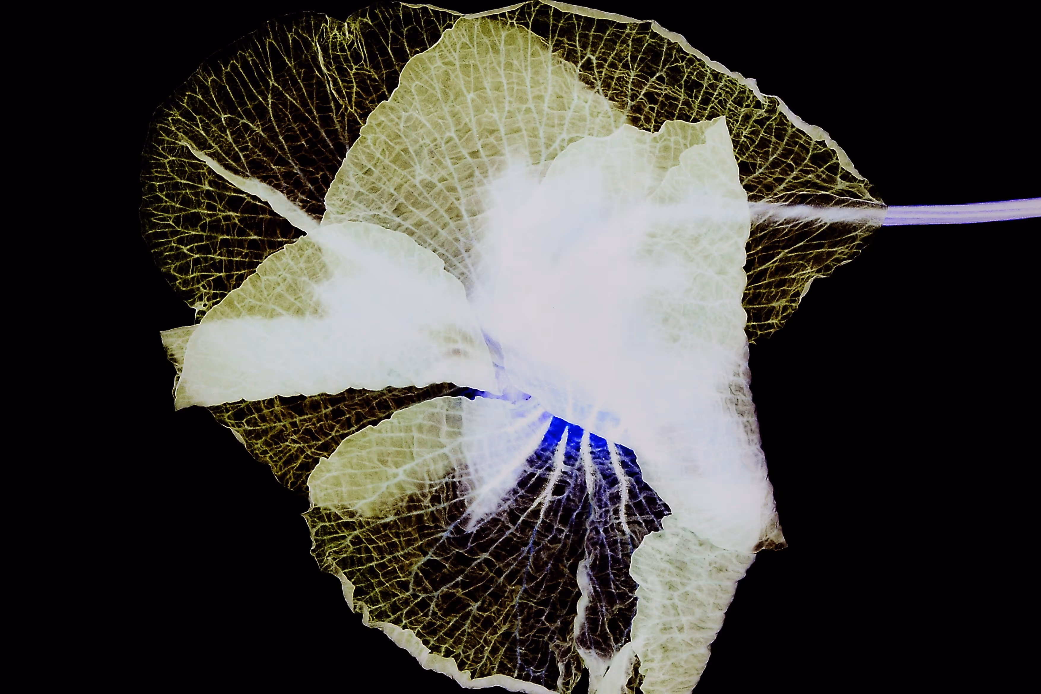 Thanks to the method used - transparency, inversion of colours and transformation of textures - these fragments of reality become something else. The flower undergoes a metamorphosis, losing its original status to give birth to a new entity, a hybrid creature that is both foreign and familiar. Suspended between life and death, it seems frozen in a state of latency, like a spectral memory imprinted on the surface of the image.