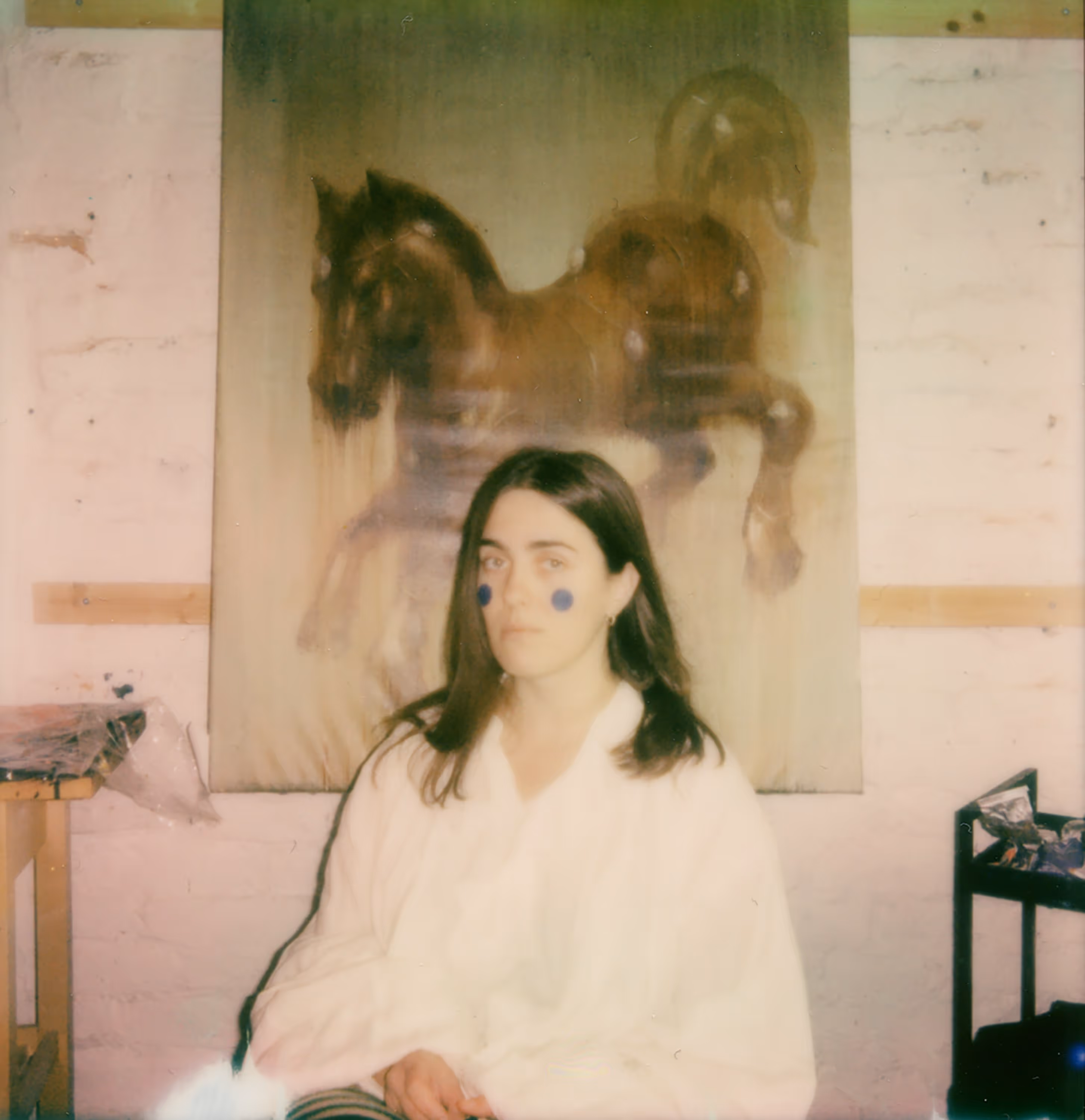 her half-sister, Elina: her father’s daughter from his second marriage. The photographs were taken at their family home in Varzas, which the artist visits every summer. Here, a greenhouse becomes an improvised photo studio, where she takes a new portrait of her sister each year.
